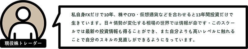 投資は様々な用語が飛び交い、難しいという印象を持たれる方もたくさんいらっしゃいます。自分自身が呑み込みの悪い人間でしたから、出来ない人、わからない人の気持ちが手に取るようにわかります。難しい言葉を知らない私だからこそ出来る易しく丁寧な解説で、初心者の方にゆっくりと学習してもらえる環境を作っています。